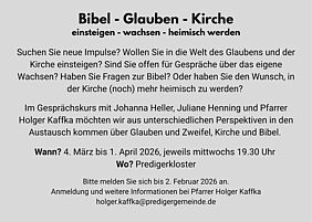 Im Gesprächskurs möchten wir aus unterschiedlichen Perspektiven in den Austausch komen über Glauben und Zweifel, Kirche und Bibel.